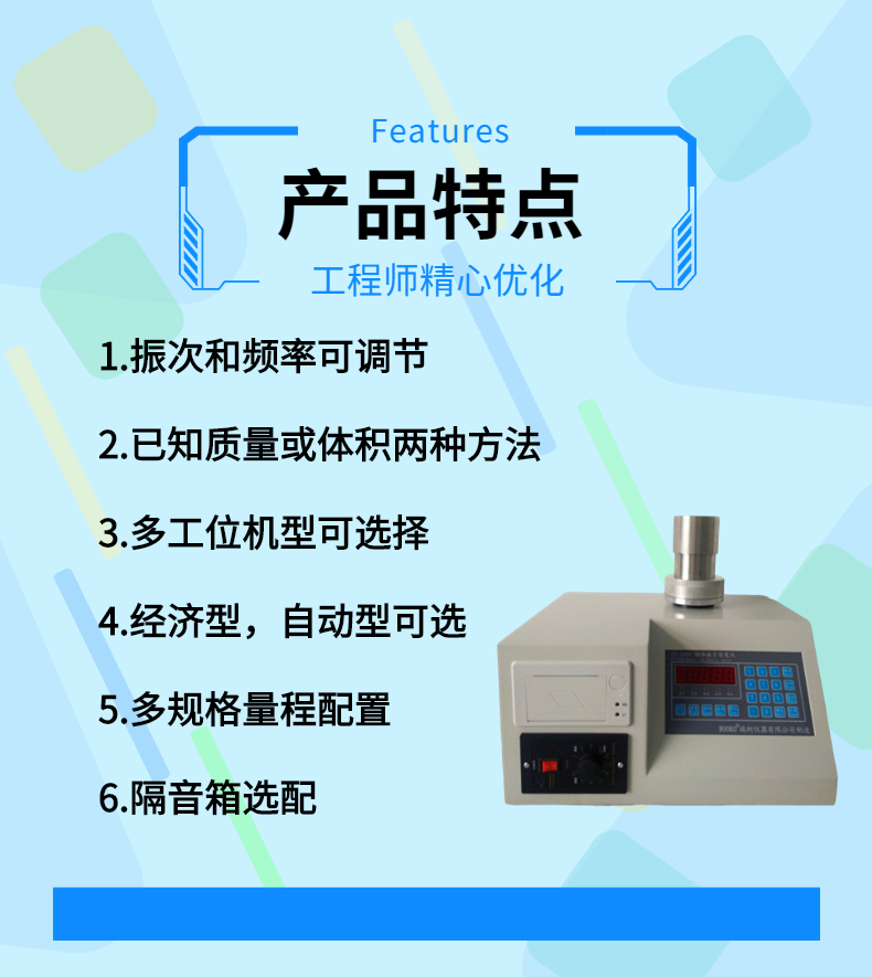 对粉末和颗粒振实密度、松装密度、堆积密度、安息角(休止角)、质量流速、体积流速项目测量,综合反映粉体流动性和表征特性状况,通过卡尔指数,豪斯纳比指数综合评定物料流动性状况.